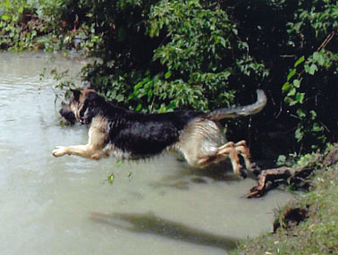 Should my big lazy bug happen to spy water - LOOK OUT – he is suddenly the greatest athlete in the dog world. He will spend hours swimming, fetching the toys thrown into the water, trying to catch the little fish swimming by, anything. This summer, after I had given up any hope of him being a service dog and having a job, he amazed me. A young man was floating by on a inner tube and playfully shouted out Help! Help! when he saw the big GSD playing in the water.