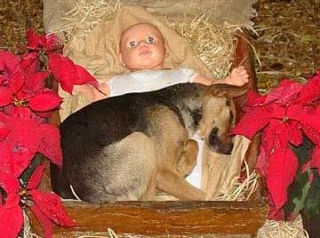 An abandoned dog was looking for a comfortable, protected place to sleep. He chose baby Jesus as his comfort. No one had the heart to send him away so he was there all night.